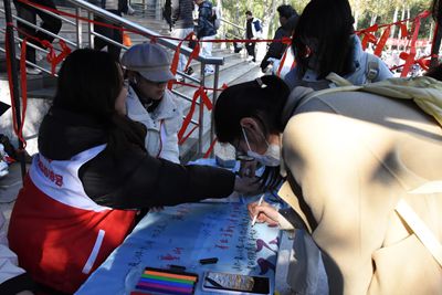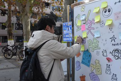 活动前期,志愿者有序完成场地布置,备齐旗帜、展板、红布条与便签纸等物资,为活动的顺利开展提供了有力保障。活动开始后,同学们在志愿者的引导下踊跃参与,以多种形式向考研学子传递温暖祝福:有的将祝福语书写于红布条上,成为现场一抹流动的风景,将温暖持续扩散;有的则选择在便签纸上留下真挚寄语,一字一句都凝聚着对学长学姐的美好祝愿。这些便签被逐一粘贴于展板上,逐渐汇聚成一面承载着无数鼓励与希望的“祝福墙”。