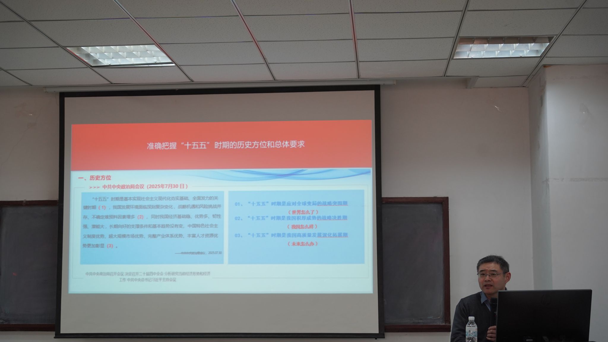杨立志以《奋力开创中国式现代化新局面——深入学习党的二十届四中全会精神》为题,解读“十五五”规划。他指出“十五五”处于应对全球变局、积厚成势、高质量发展深化拓展期,需聚焦发展安全、突出新质生产力培育。从国民经济、社会发展、安全保障三大层面,梳理现代化产业体系、科技自立自强、民生保障等重点任务,强调以科学化理论、制度、方法落实规划,坚持党的全面领导,以人民为中心,为基本实现社会主义现代化筑牢基础。